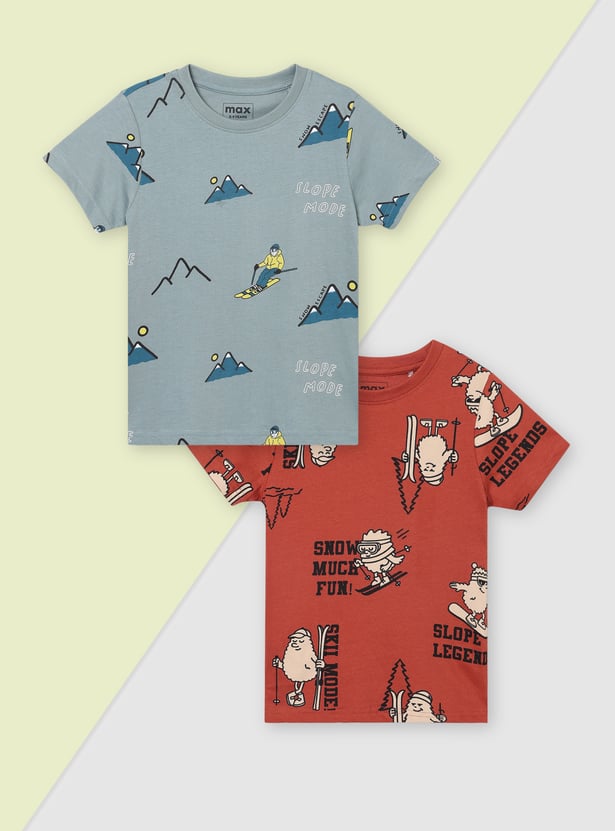 Double the style, double the fun, this assorted pack of two T-shirts is made for his everyday rotation. It is designed with a comfortable crew neck and half sleeves. The set includes two versatile styles with assorted prints.