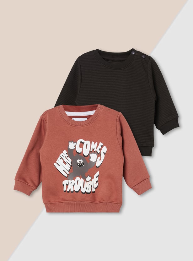 Refresh your cozy essentials with this pack of two assorted sweatshirts featuring a classic crew neck, full sleeves, and a convenient snap button closure at the neck.