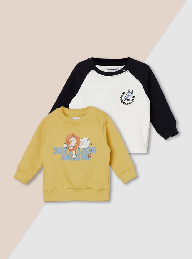 Refresh your winter must-haves with this cosy pack of two assorted sweatshirts, featuring a classic crew neck, full sleeves, and a snug ribbed hem. Designed with a handy snap-button closure at the neck for easy dressing.