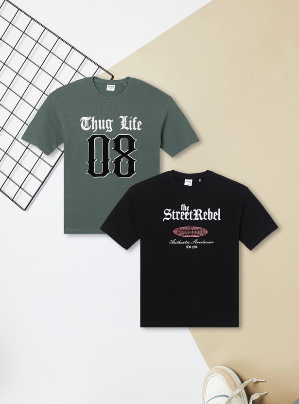 Refresh everyday essentials with this assorted t-shirt in a pack of 2. Each tee is designed with a classic crew neck and half sleeves. Perfect for casual comfort and effortless style, these printed t-shirts add a playful touch to the wardrobe.