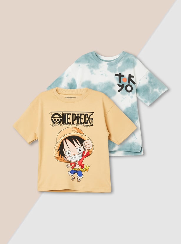 This pack of two assorted T-shirts includes a One Piece printed tee and a trendy tie-dye style with a placement print. Both feature a crew neck and half sleeves for easy, everyday comfort.