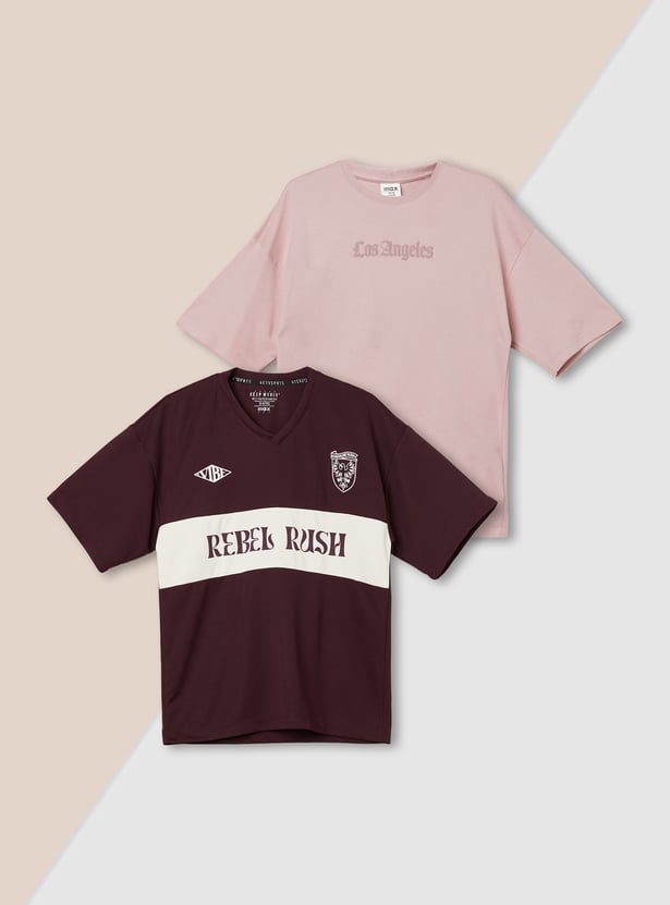 Casual and trendy, this pack of two printed T-shirts features half sleeves. One features a crew neck while the other has a V-neck. Designed for everyday comfort with stylish prints that add a playful edge.