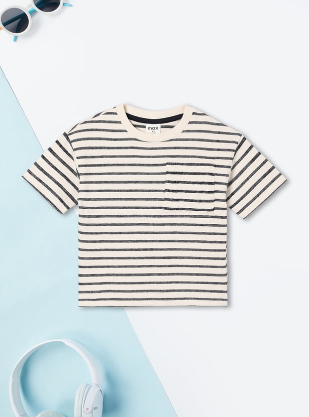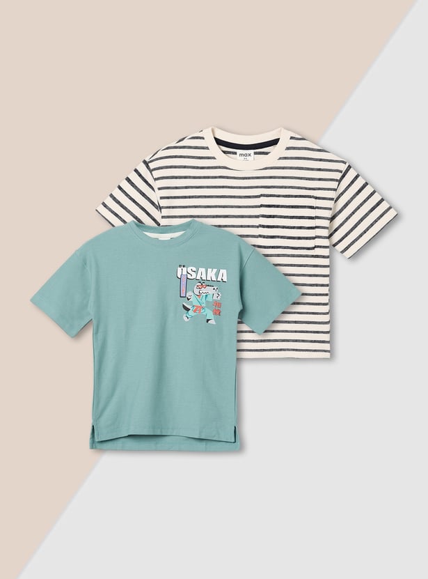 This pack includes two assorted T-shirts crafted with a classic crew neck and half sleeves—one detailed with clean stripes and the other finished with a fun print for a versatile mix of styles.