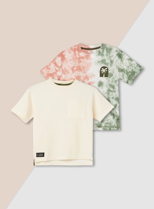 This pack of 2 assorted T-shirts includes one tie-and-dye design and one solid tee, both crafted with a comfy crew neck and half sleeves. They offer an easy, everyday fit with a mix of bold and basic styles.