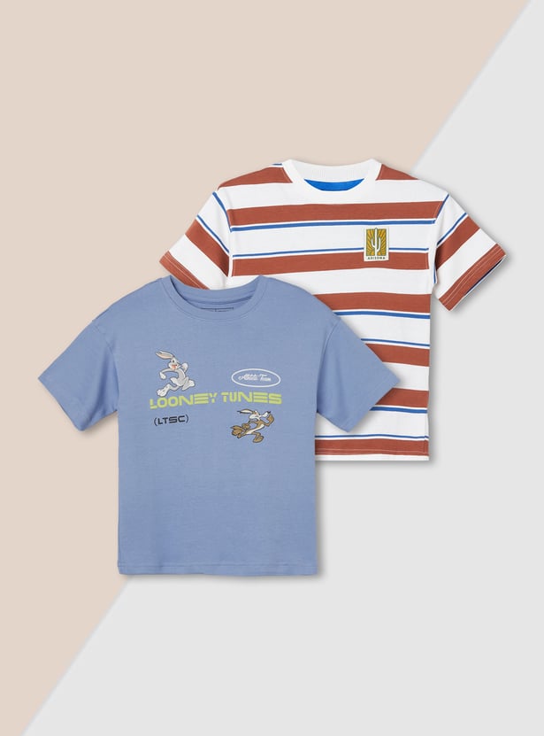 Upgrade casual days with this duo of T-shirts—one featuring a fun Looney Tunes print and the other styled with classic stripes. Both come with a crew neck and half sleeves for easy, everyday comfort.