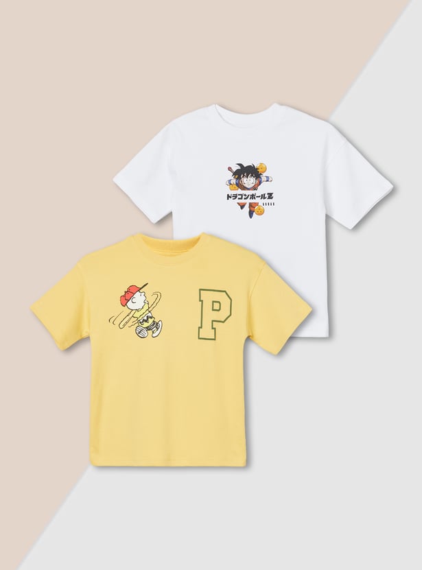 Add fun to your wardrobe with this pack of 2 character print T-shirts. Featuring crew necks, half sleeves, and back prints, one showcases a playful Peanuts design while the other highlights a bold Dragon Ball Z print.