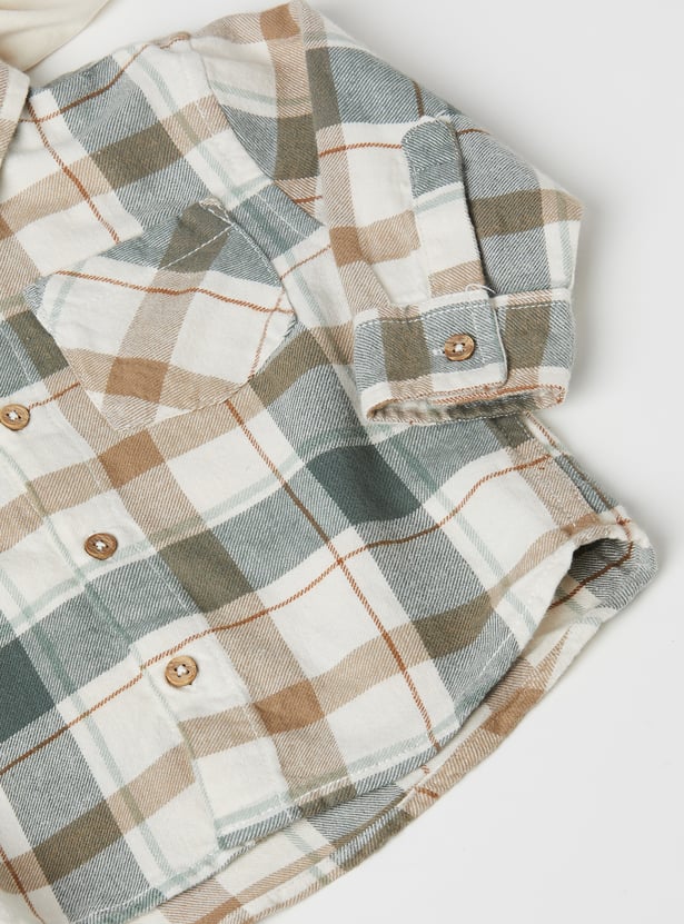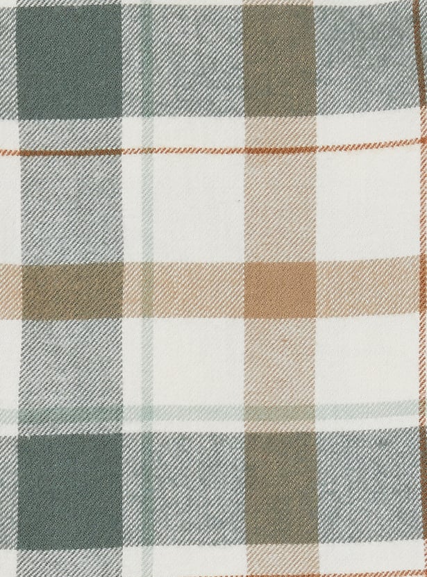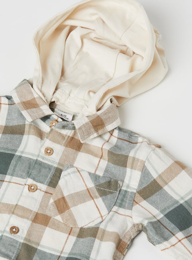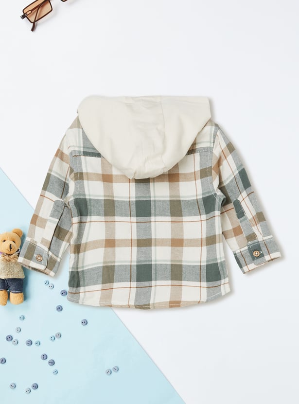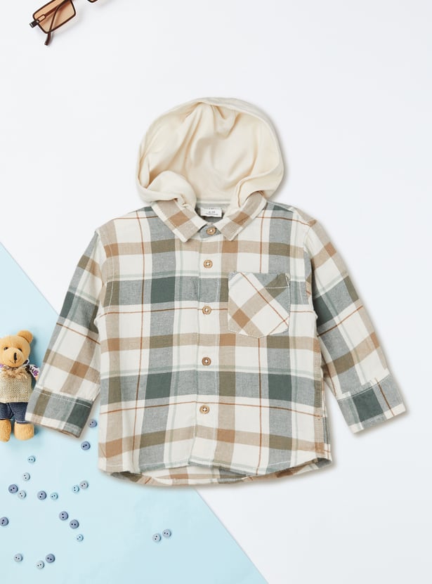 Blending casual comfort with classic style, this checked hooded shirt features a full button placket, patch pocket, and full sleeves with buttoned cuffs.