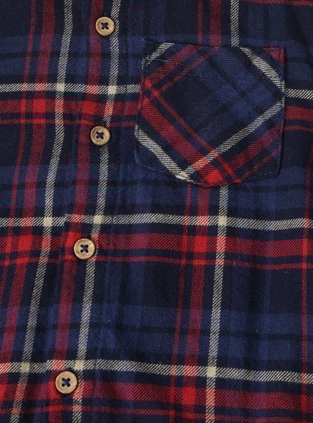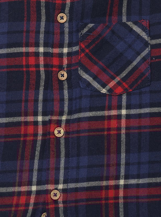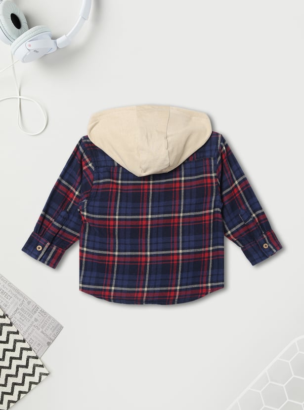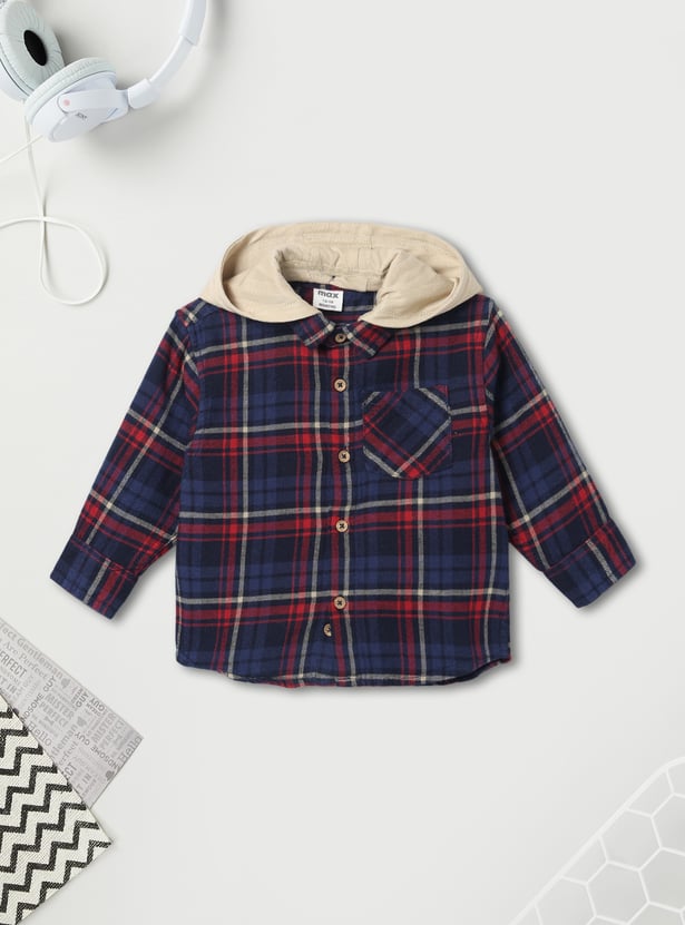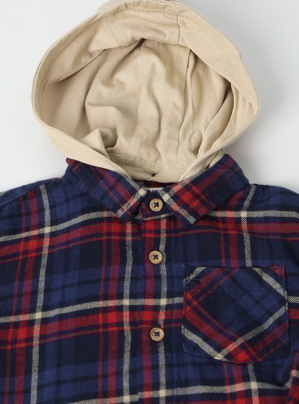 Add a laid-back touch to your wardrobe with this checked hooded shirt featuring a button closure, patch pocket, and full sleeves.