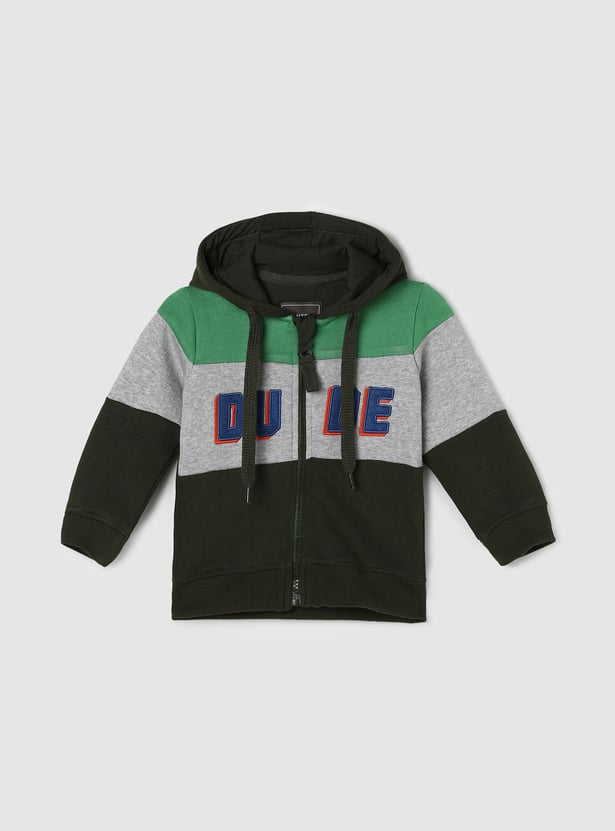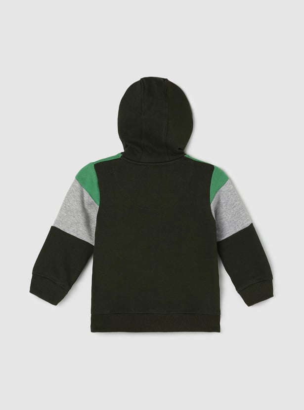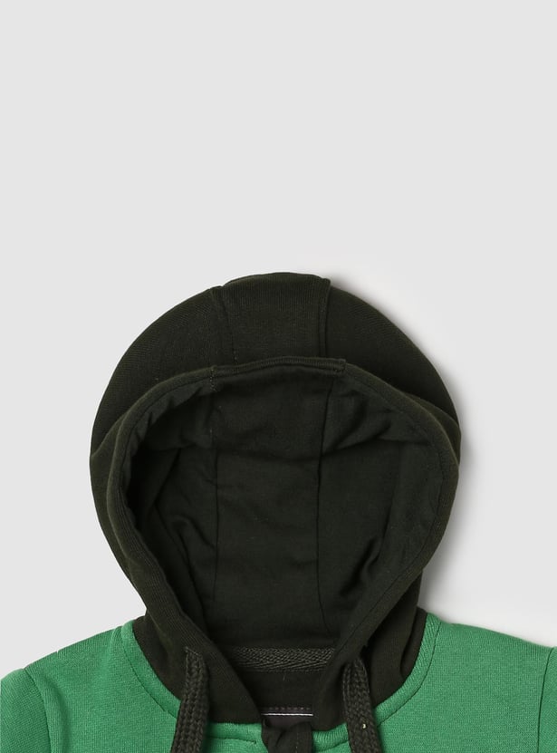 Designed with a colourblock design and appliques, this medium-weight sweatshirt is bound to become his go-to option this winter. It features a hooded neck, long sleeves, a zip front, and ribbed trim.