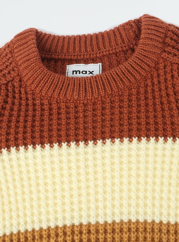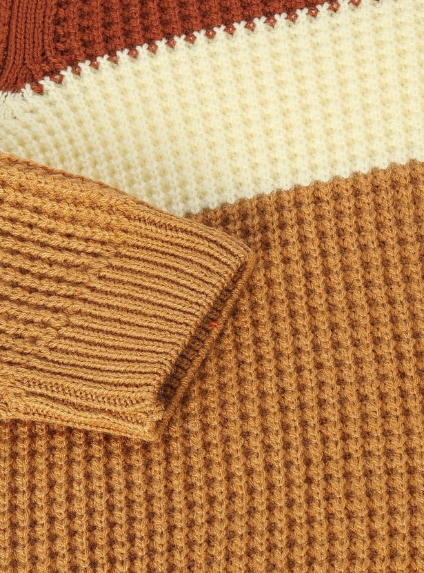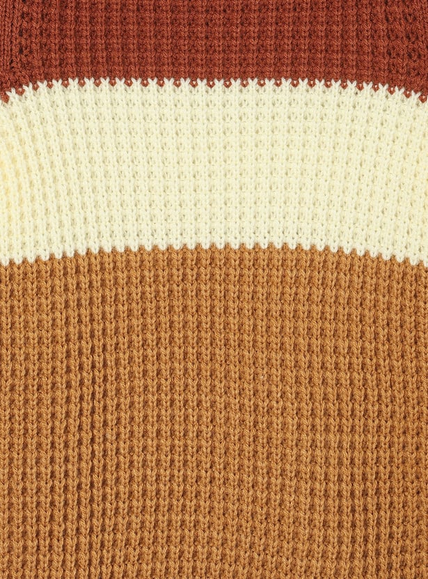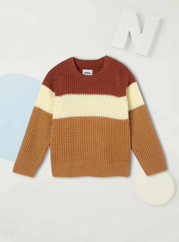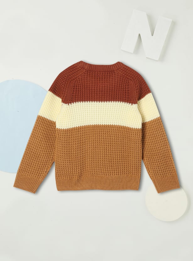 Upgrade your little one's winter wardrobe with this cozy sweater, showcasing a stylish color-blocked design. Featuring a classic crew neckline, full sleeves, and a ribbed hemline, it's perfect for keeping them warm and trendy during chilly days.