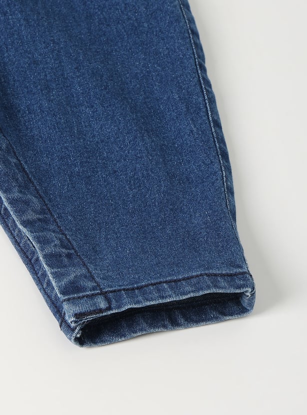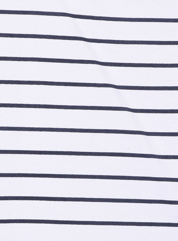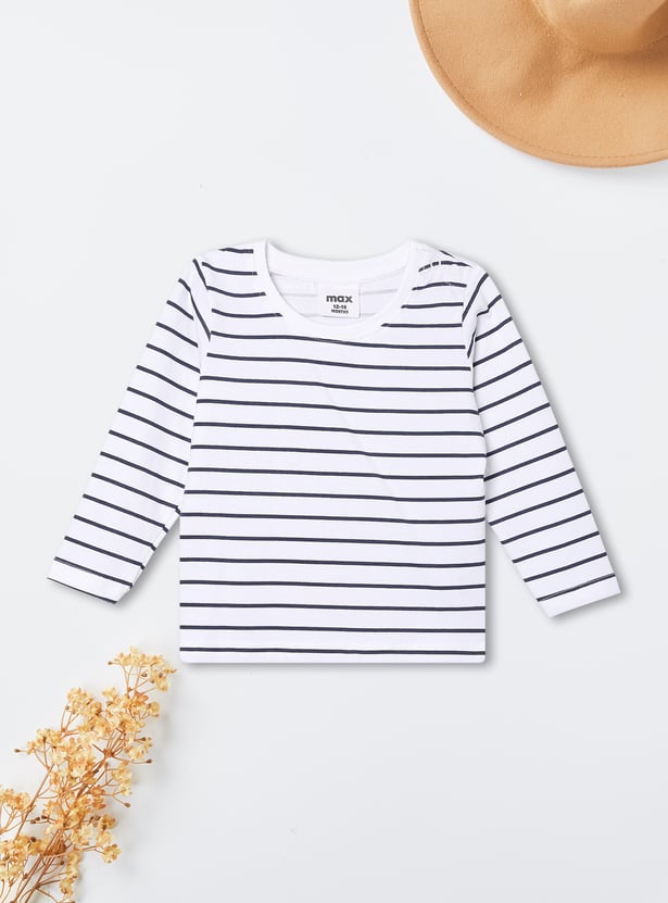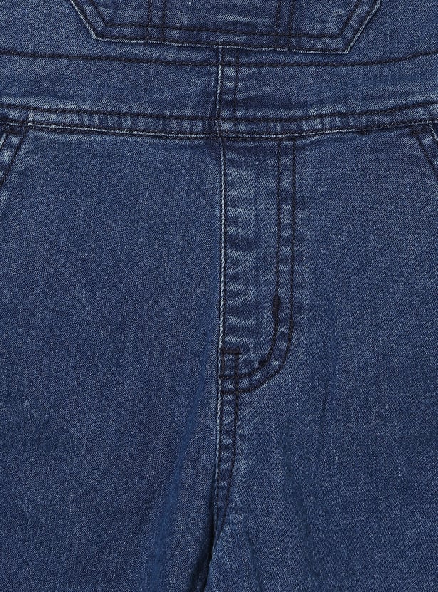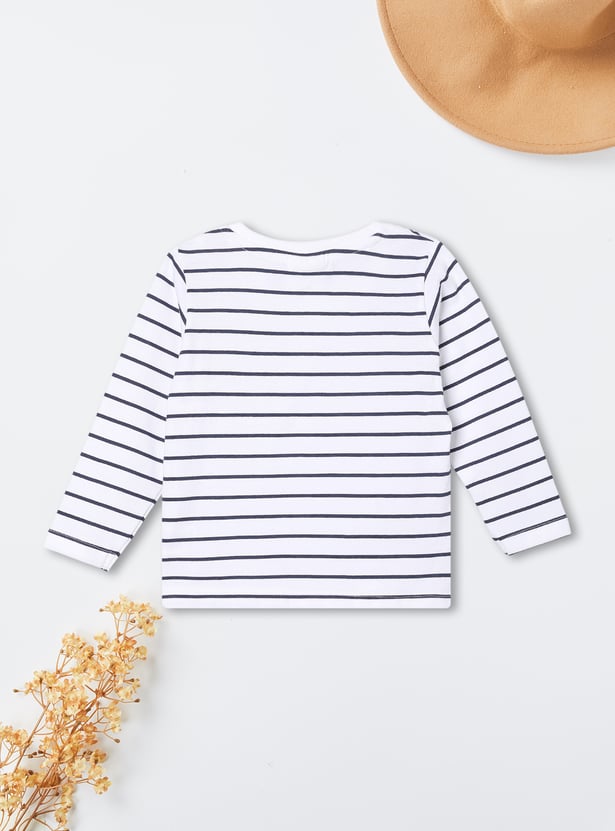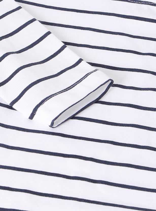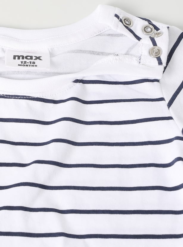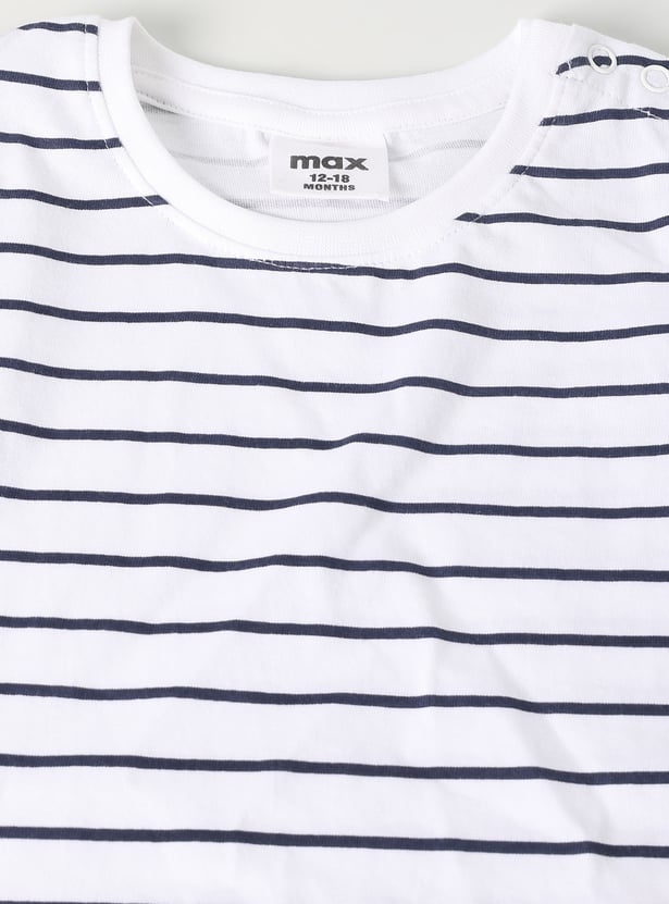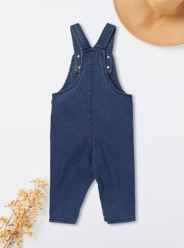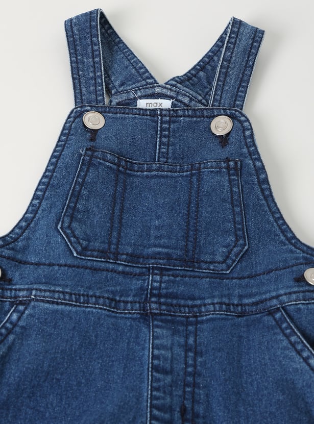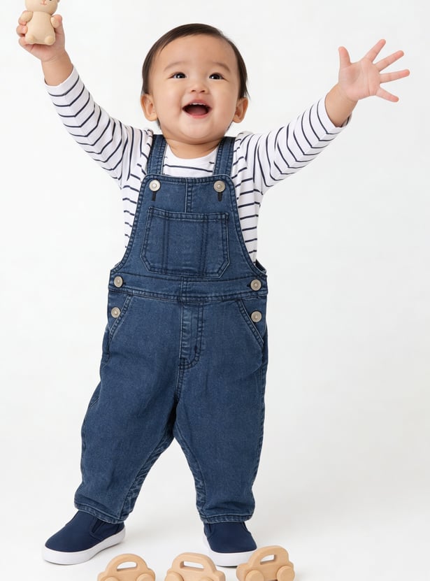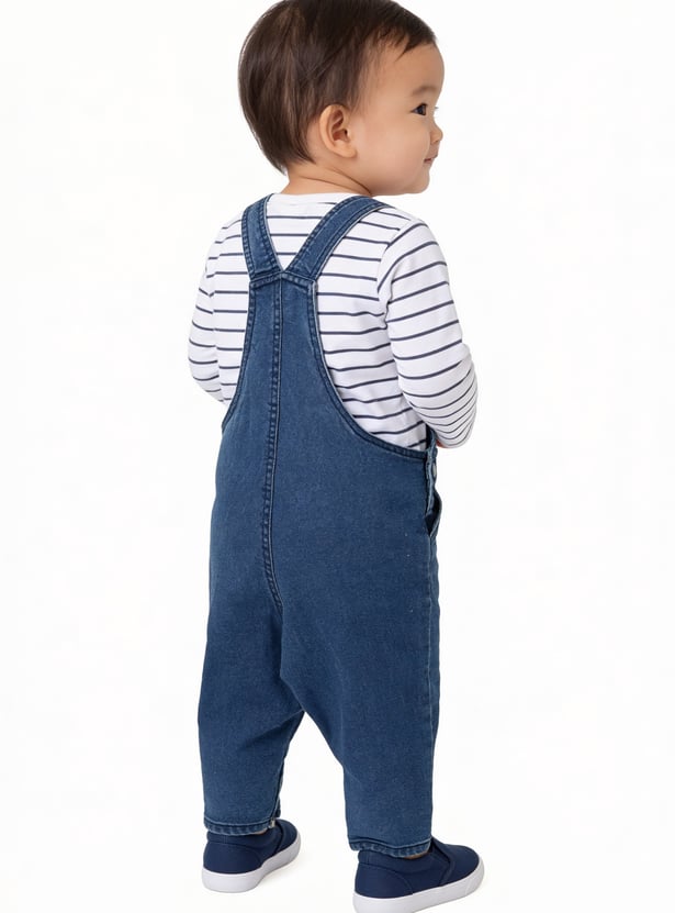 This boys denim dungaree set is a classic pick for playful days. The full-length dungaree features adjustable straps and pocket detailing, paired with a striped full-sleeve crew-neck T-shirt for a timeless look.