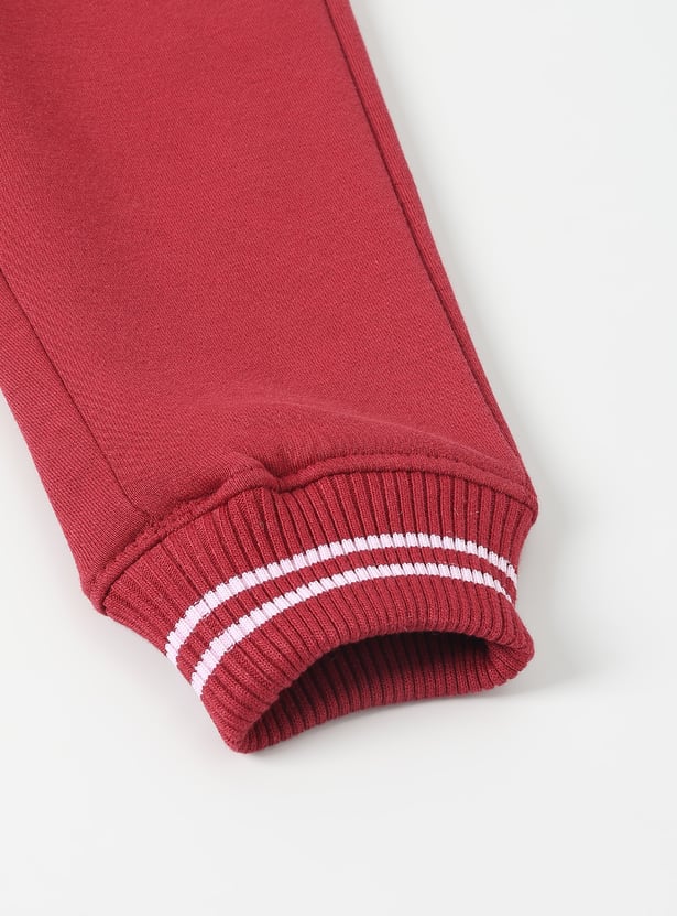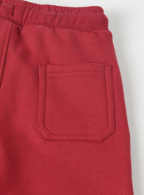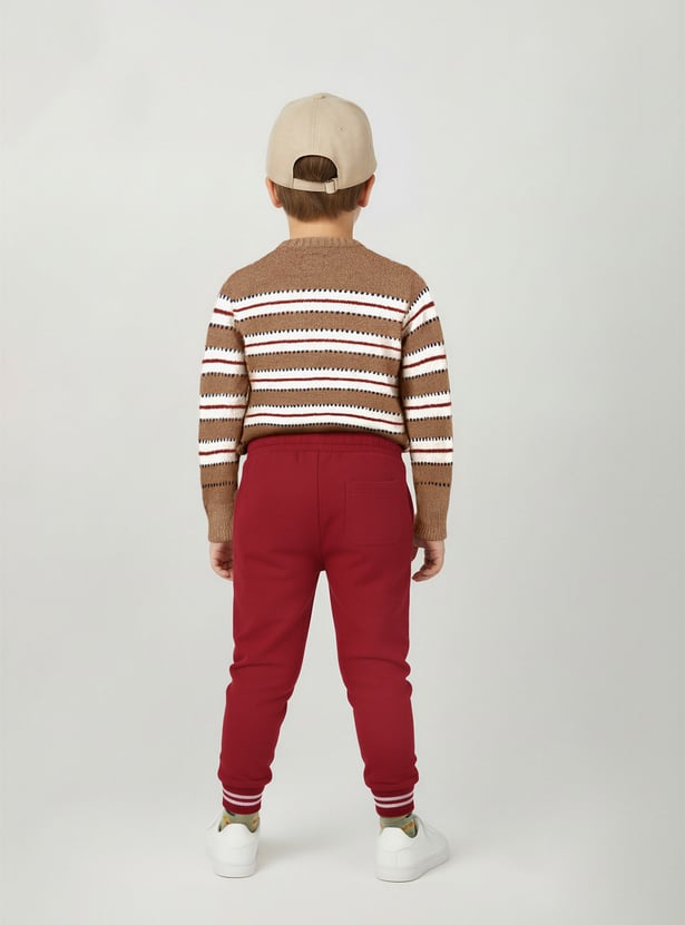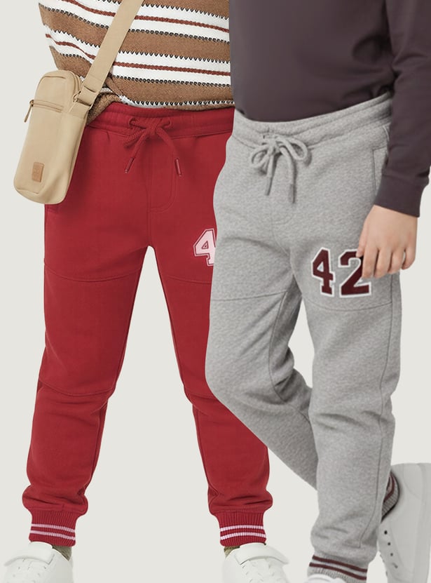 Keep his everyday style comfortable and versatile with this pack of 2 joggers. Designed with an elasticated waistband and drawstring closure, they feature handy side pockets and an applique detail for added interest. Finished with ribbed cuffs accented with stripes, they offer a snug fit with a sporty look.