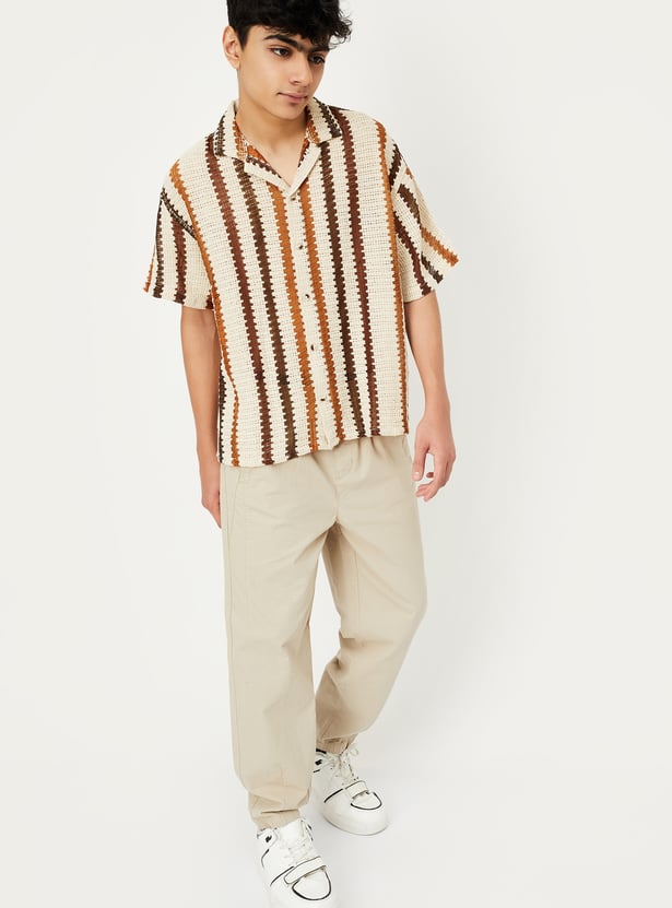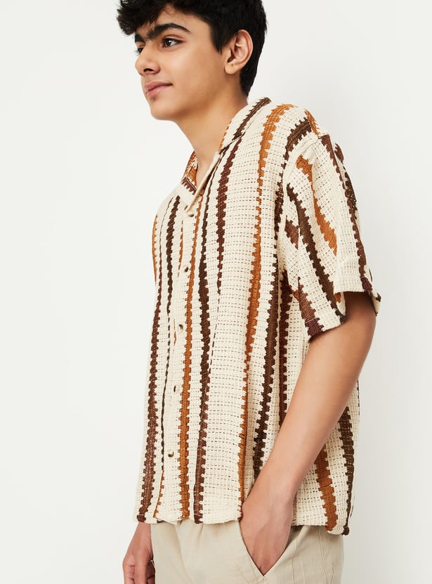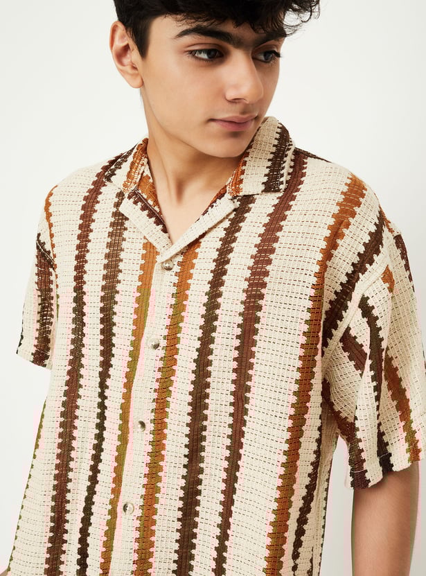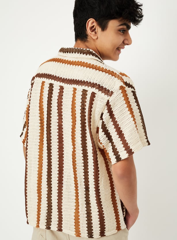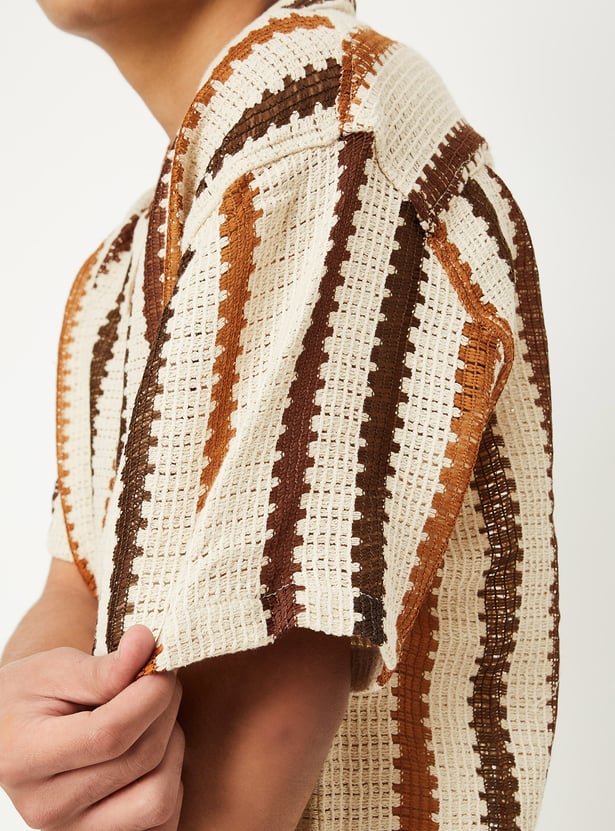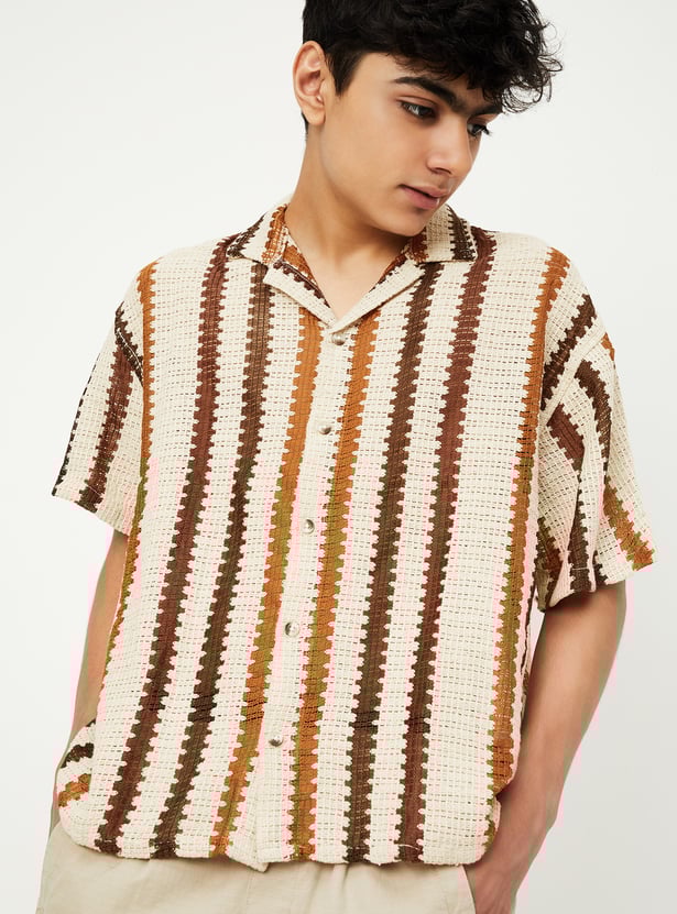 This knit striped resort shirt brings vacation vibes to your wardrobe with its relaxed fit, resort collar, and breathable half sleeves. The button placket adds classic structure, while the bold pattern makes it perfect for sunny getaways or laid-back weekends.