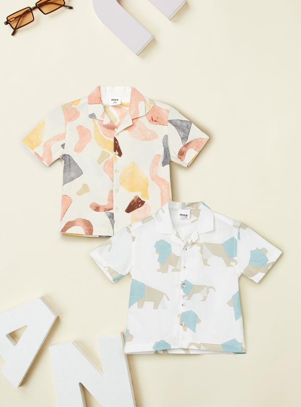 Style meets comfort with this pack of two boys’ printed shirts. Featuring a breezy resort collar, half sleeves, and a smart button placket, these shirts are perfect for casual outings, playdates, or holiday wear.