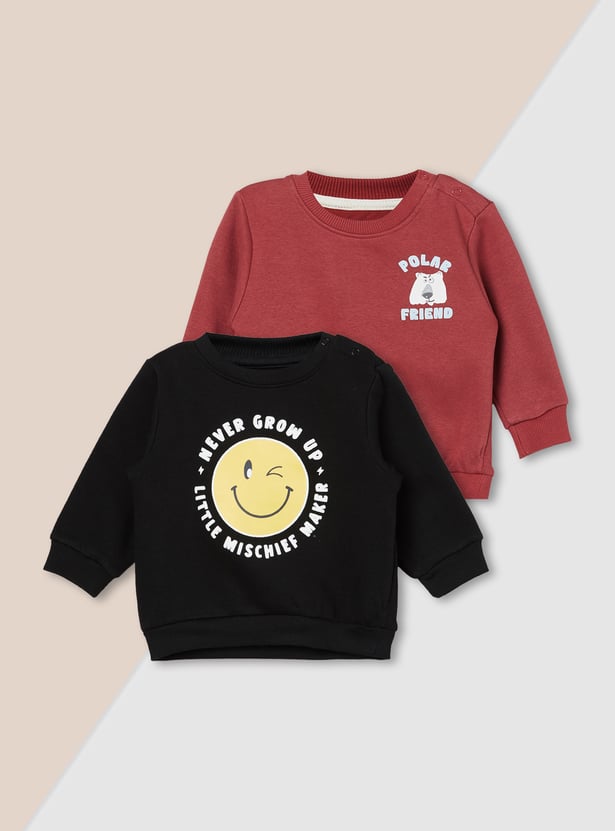 Refresh your winter must-haves with this cosy pack of two printed sweatshirts, featuring a classic crew neck, full sleeves, and a snug ribbed hem. Designed with a handy snap-button closure at the neck for easy dressing.