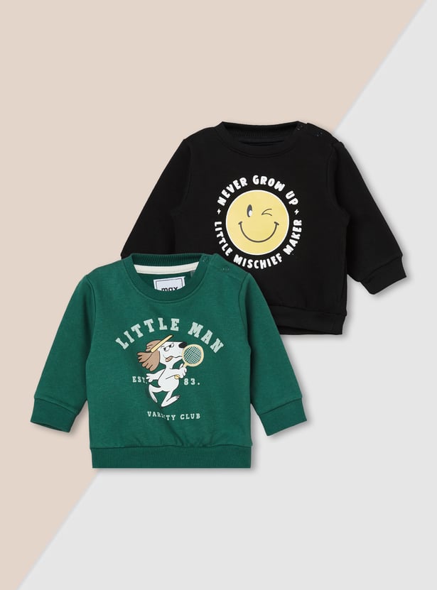 Refresh your winter must-haves with this cosy pack of two printed sweatshirts, featuring a classic crew neck, full sleeves, and a snug ribbed hem. Designed with a handy snap-button closure at the neck for easy dressing.