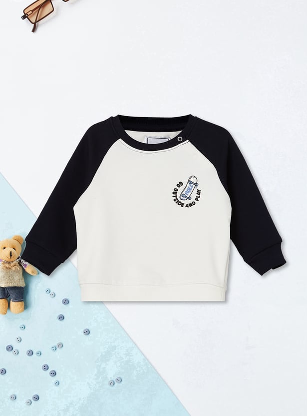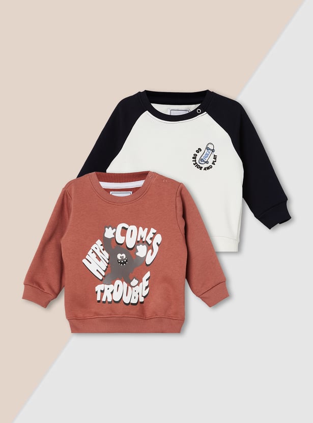This pack of 2 boys’ printed sweatshirts is a cozy addition to casual wardrobes. Each features a crew neck, full sleeves, and a convenient button closure on the shoulder for easy dressing.