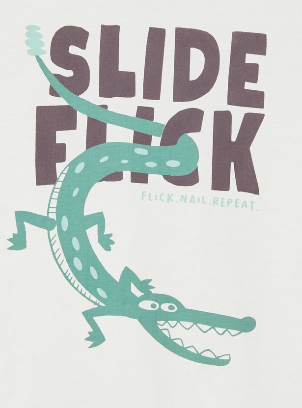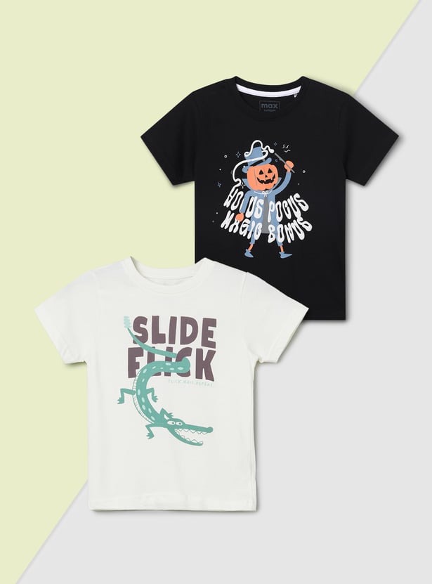 Refresh your kids’ collection with this Pack of 2 printed T-shirts, each styled with a classic crew neck and half sleeves for everyday comfort. The playful prints add charm and versatility, making them perfect for school, playdates, or casual outings.