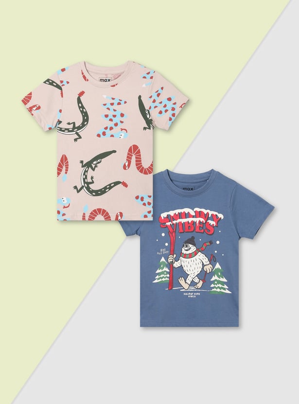Brighten up your kids’ wardrobe with this pack of 2 printed T-shirts, designed with a classic crew neck and half sleeves for all-day comfort. Featuring playful prints, these versatile tees are ideal for school, playdates, and casual outings.