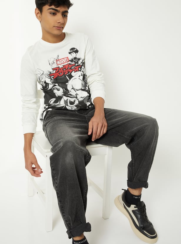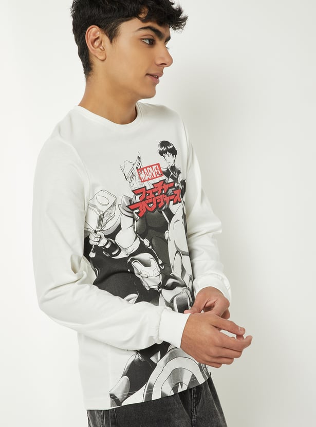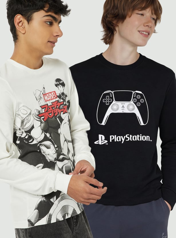 Bring fun and variety to everyday style with this T-shirt pack. This pack of 2 features a classic crew neck and full sleeves for comfortable wear. One T-shirt showcases a printed design, while the other features an Avengers print for a bold, playful touch.