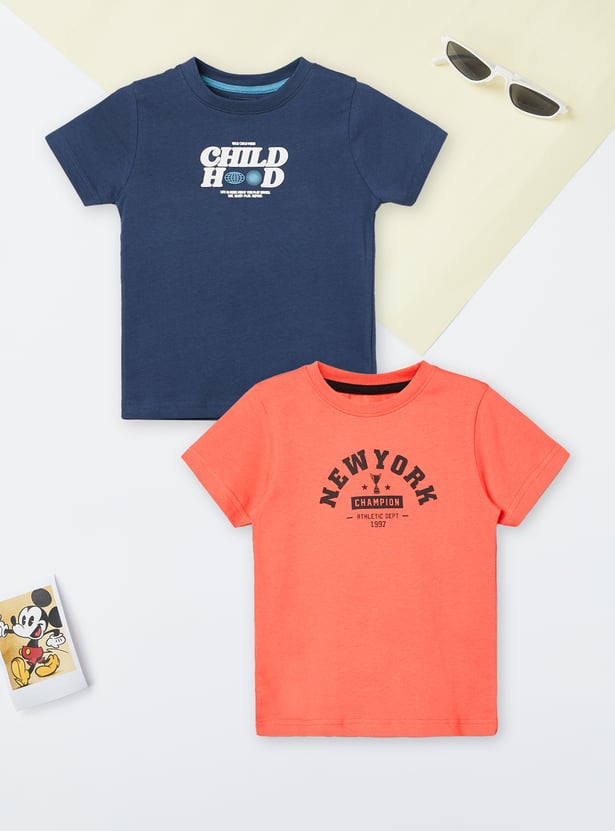 Add fun to your boy’s wardrobe with these stylish T-shirts. One features a graphic design, while the other showcases a bold car print. Both have a classic crew neck and half sleeves for a trendy and comfortable look.