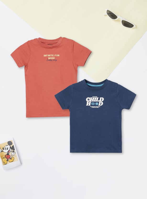 Make playtime exciting with these fun T-shirts. One features 'Infinite Fun Mode' with a playful text print, while the other showcases 'Childhood' with a graphic detail. Both have a classic crew neck and half sleeves, ensuring comfort and style.