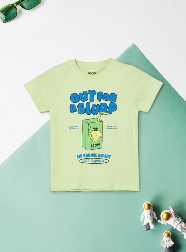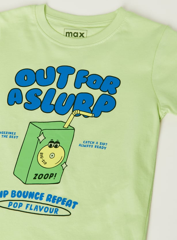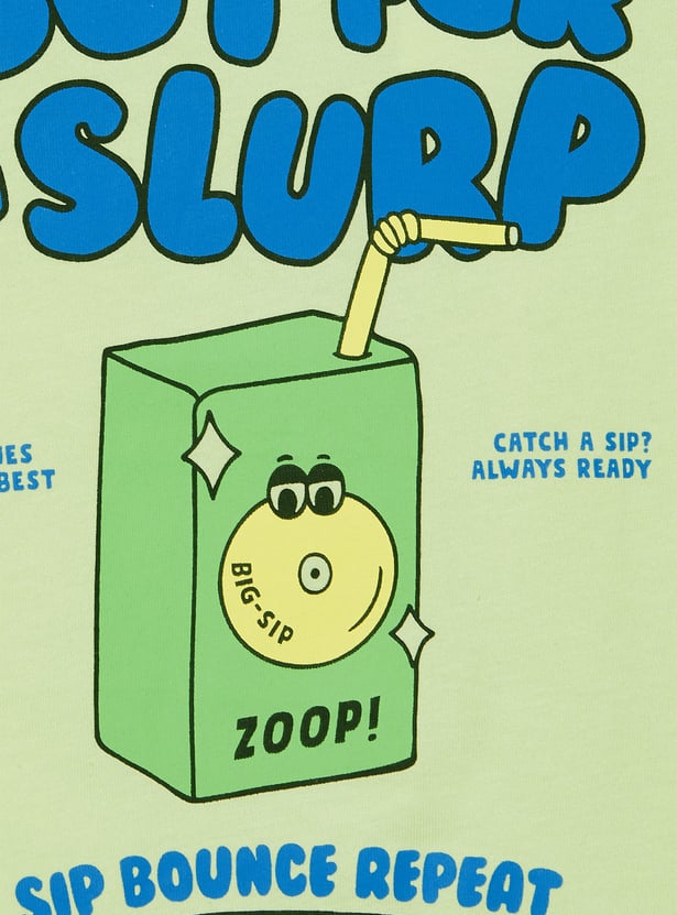 Add fun to your boy's wardrobe with this pack of 2 T-shirts. One features a playful 'Childhood' text print, while the other showcases a quirky juice box graphic with text elements. Both T-shirts come with a crew neck and half sleeves for all-day comfort.