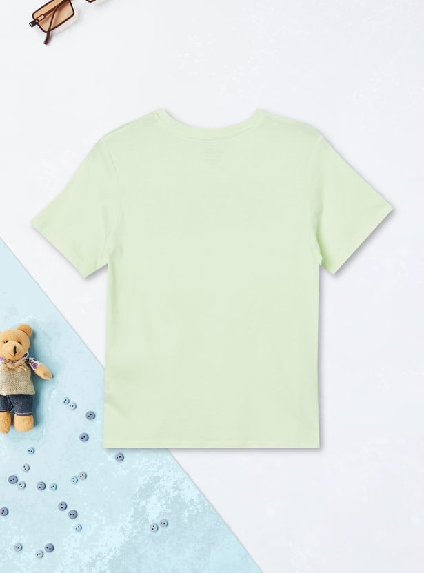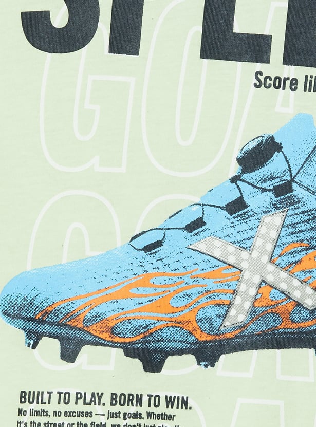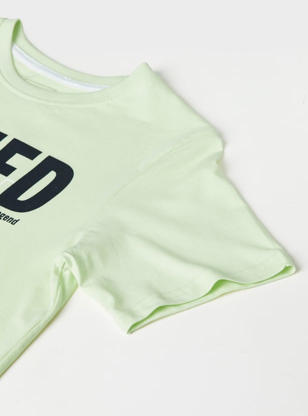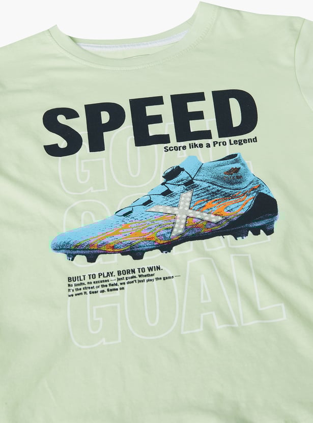 Bring excitement to your kids wardrobe with this pack of 2 printed T-shirts. One features a bold 'Pixel' gaming-inspired design, while the other showcases a 'Speed' soccer-themed print. Both T-shirts have a crew neck and half sleeves for a casual, sporty look.