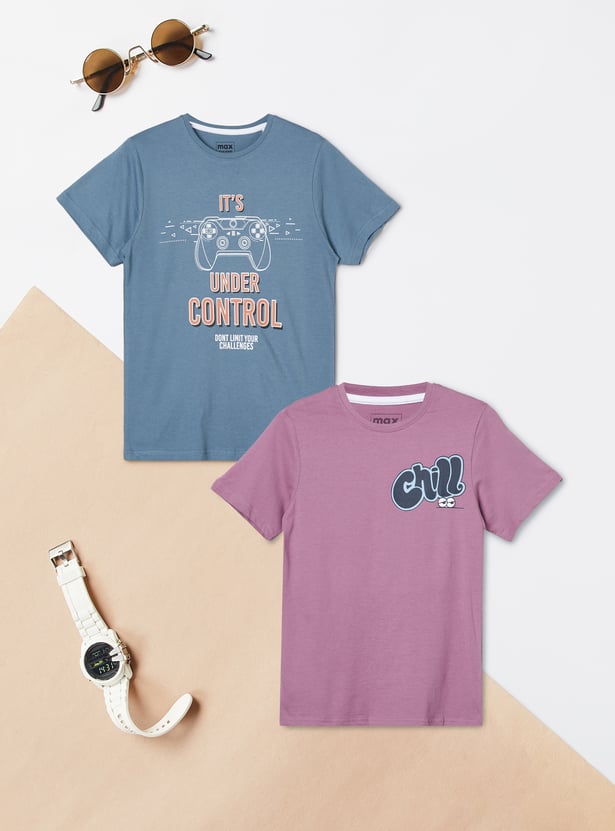 Refresh your kids everyday wardrobe with this pack of two printed T-shirts designed for easy casual wear. Featuring classic crew necklines and comfortable half sleeves, they offer effortless style and comfort.