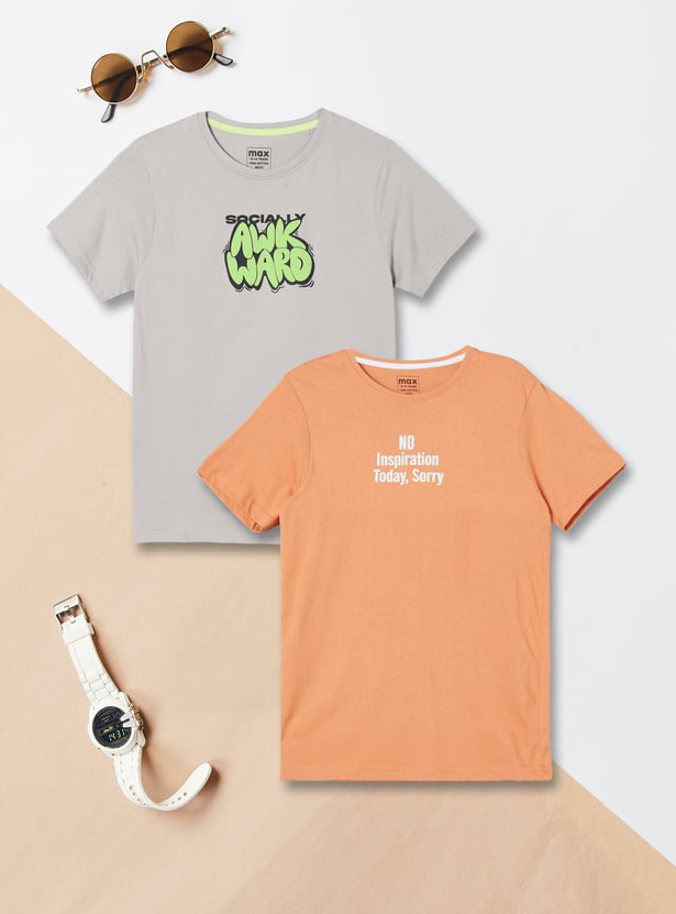 Refresh everyday looks with this pack of 2 printed T-shirts, featuring a round neck and half sleeves. Soft and breathable for all-day comfort.