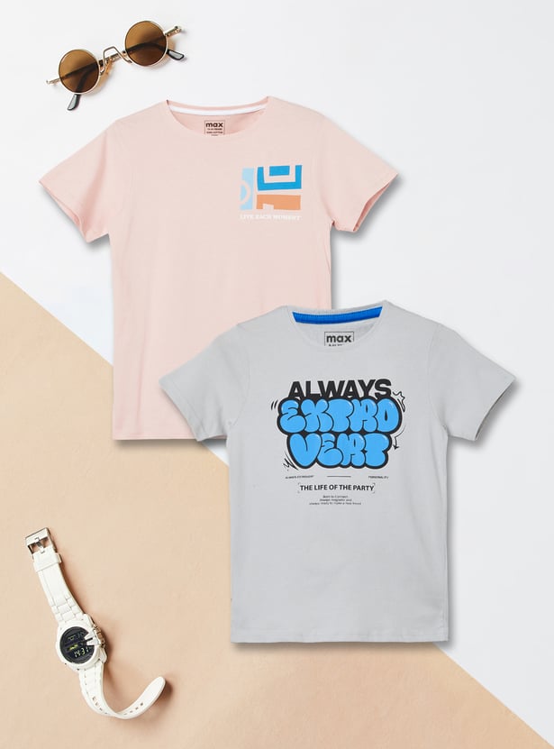Refresh everyday looks with this pack of 2 printed T-shirts, featuring a round neck and half sleeves. Soft and breathable for all-day comfort.