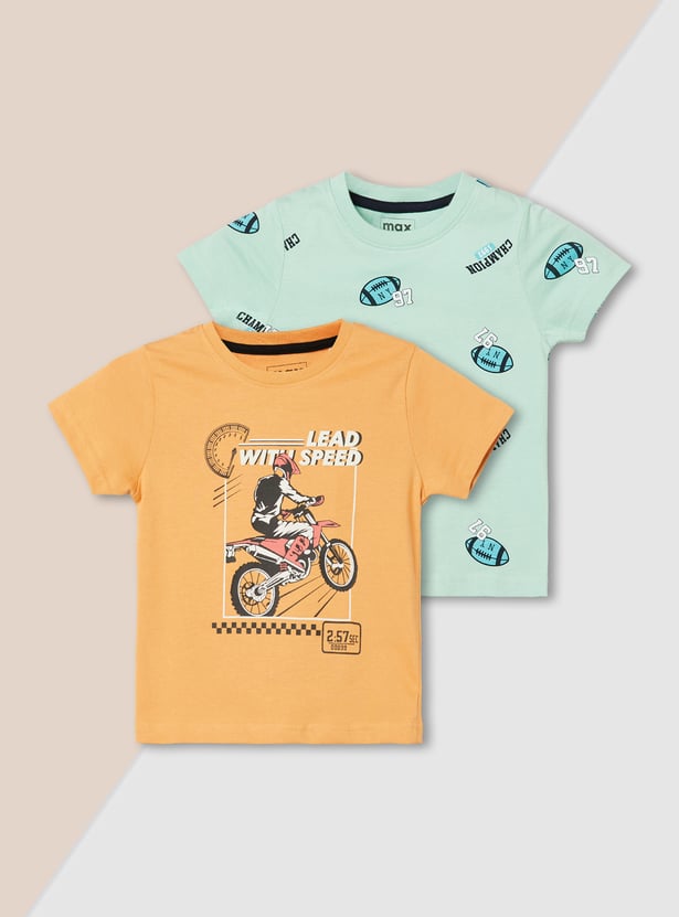 This pack of two printed T-shirts features fun designs, a crew neck, and half sleeves. Crafted for comfort and everyday wear, these tees bring a playful update to casual dressing.