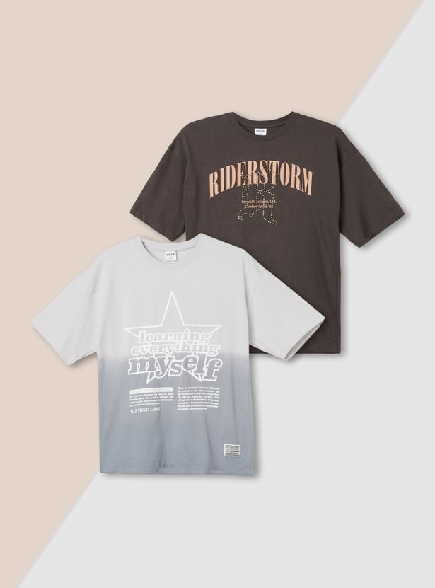 This pack of two printed T-shirts for boys features a crew neckline and half sleeves for an easy, everyday fit. Designed with playful prints and soft fabric, these tees bring comfort and style to his casual wardrobe.
