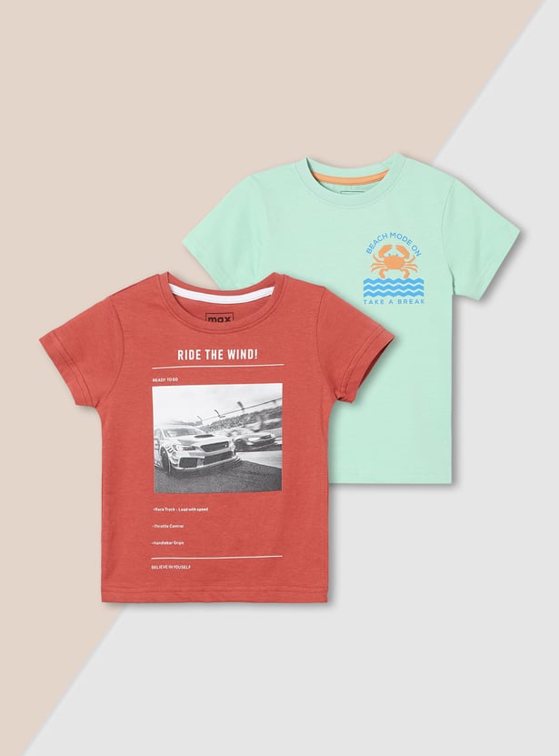 This pack offers two printed T-shirts designed with a classic crew neck and easy half sleeves, each bringing a fresh pop of colour and graphic detail to everyday dressing.