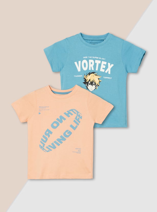 This pack of two printed T-shirts features fun graphics with classic crew necklines and half sleeves, offering comfortable everyday wear.