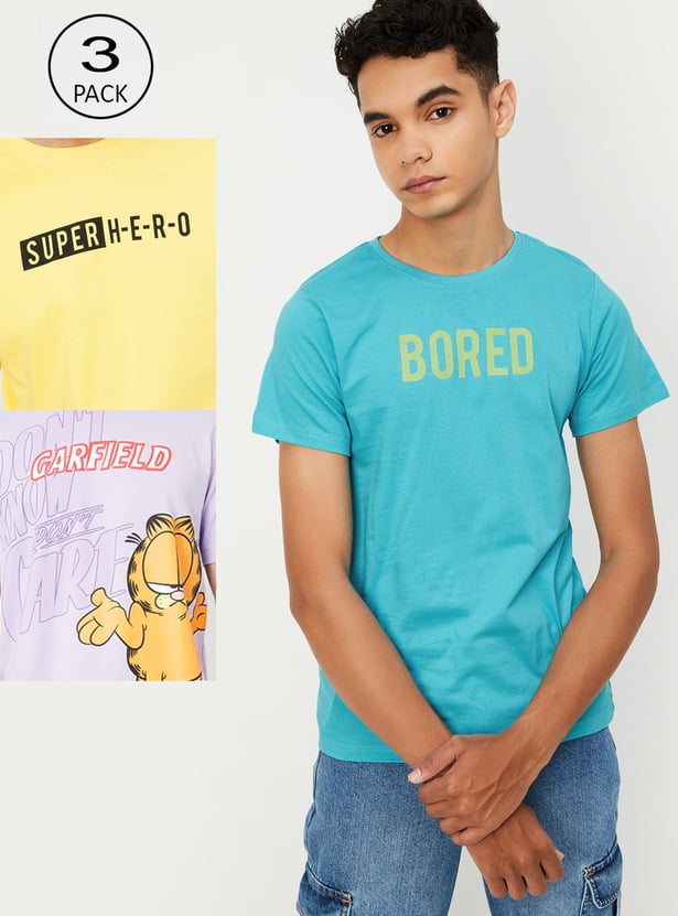 Give his everyday wardrobe an upgrade with this set of T-shirts. It includes three tees with assorted graphic prints, each featuring a classic crew neck and half sleeves. Perfect for mixing and matching to create a fresh, fun look every day.