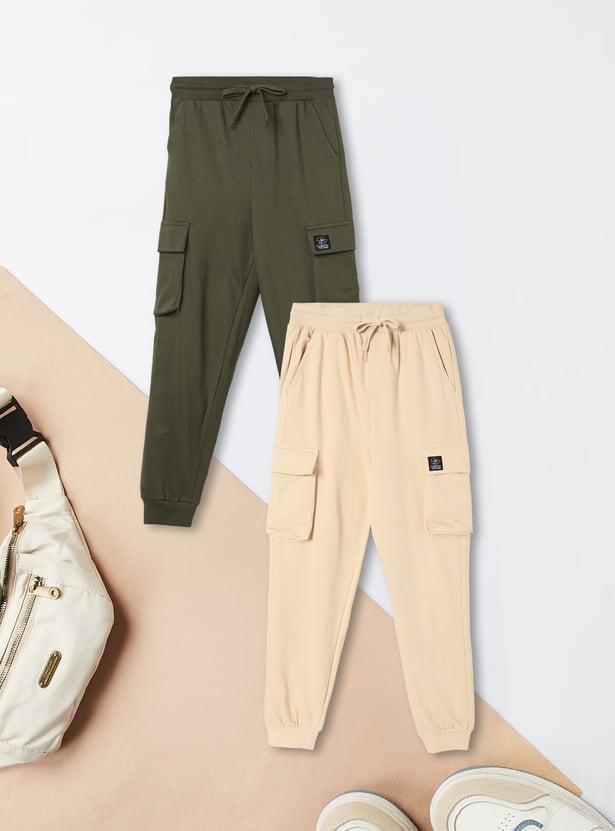 Gear up for everyday adventures with this solid cargo joggers pack. This pack of 2 features a drawstring waist and cuffed hems for a secure, comfortable fit. Designed with cross pockets, cargo pockets, and a back patch pocket, they offer both style and functionality in assorted tones.