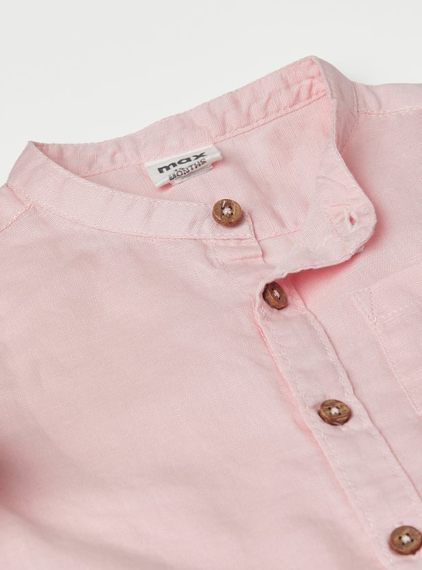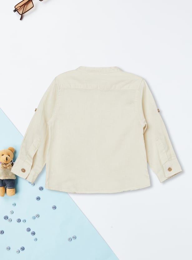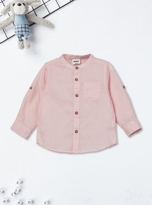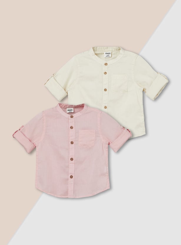 Upgrade your everyday essentials with this pack of 2 solid shirts. Featuring a band collar, button placket, and full sleeves with roll-up tabs, each shirt is finished with a practical patch pocket for added utility and style.
