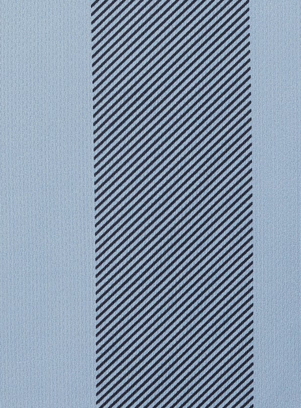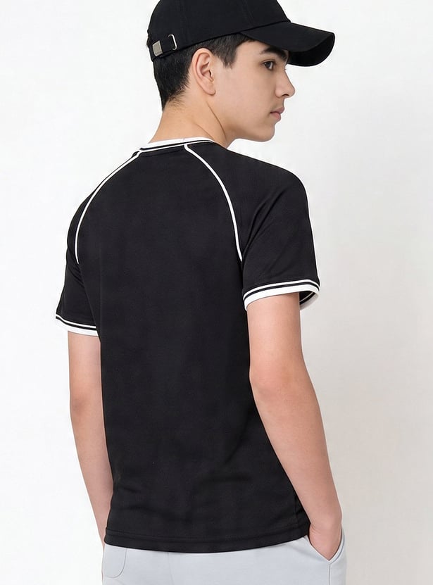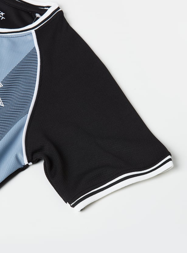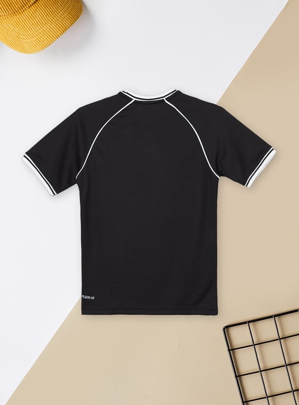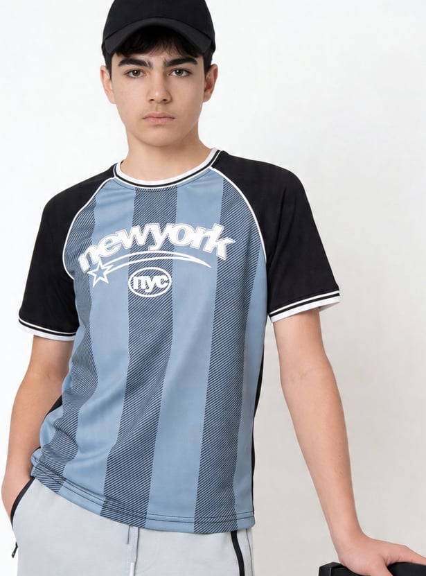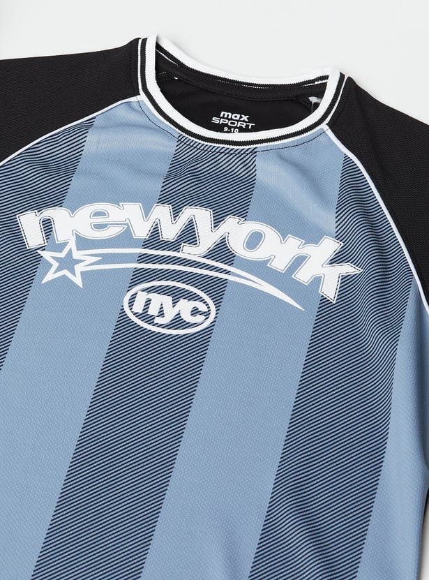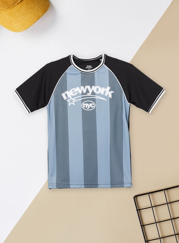 Elevate your little one's wardrobe with this stylish T-shirt. Featuring bold typography and a striped design, it offers a trendy look. Designed with a round neck, raglan sleeves, and striped trim, it ensures comfort and active wear appeal.