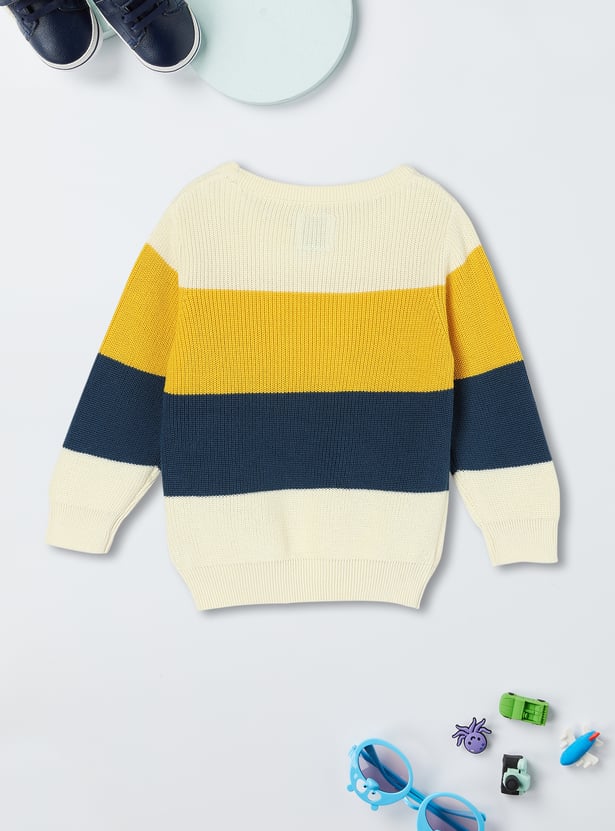 Let your kid shine this winter in this vibrant striped sweater. With its classic crew neck, ribbed hem, and full sleeves, it combines warmth with a splash of colour.