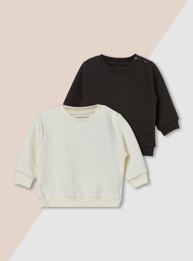 This pack offers two textured sweatshirts featuring a classic crew neck, full sleeves, and ribbed hems, both enhanced with convenient shoulder button closures that add ease and a neat, polished touch.
