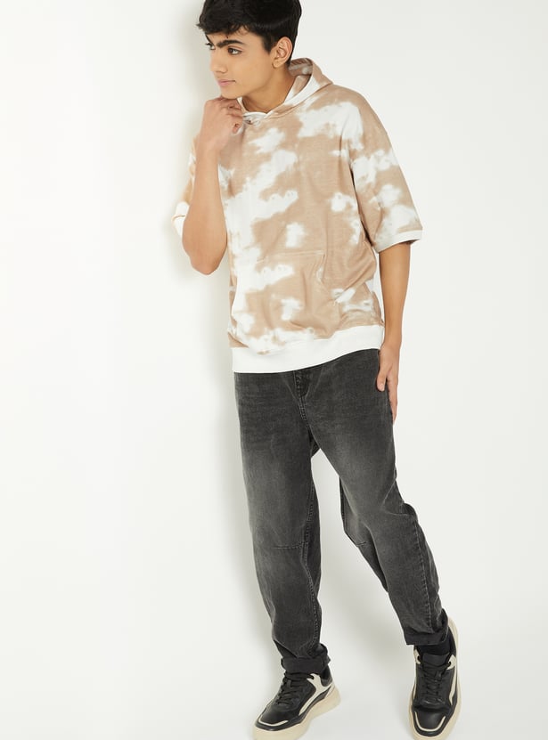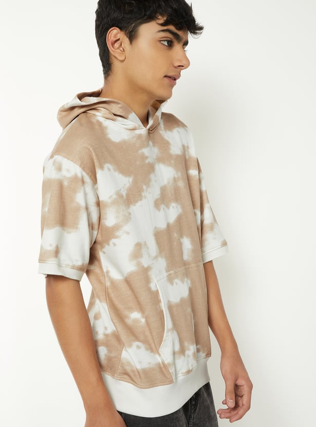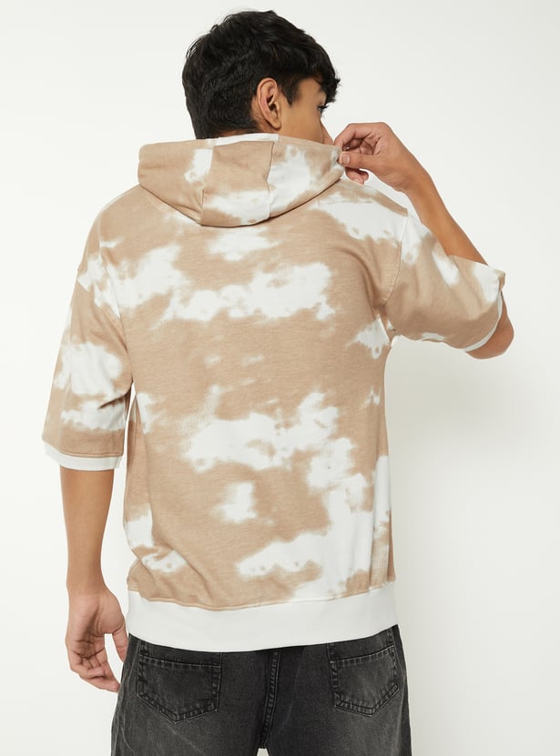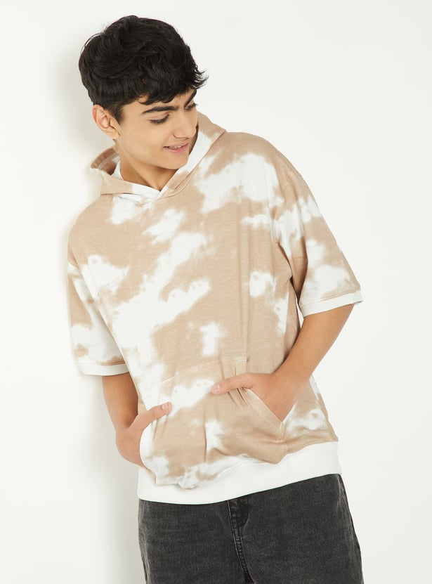 Add a splash of colour with this tie & dye T-shirt, styled with a hooded neckline, half sleeves, and a comfy kangaroo pocket for laid-back flair. The vibrant dye pattern brings playful energy, while the hoodie detail adds a sporty twist.