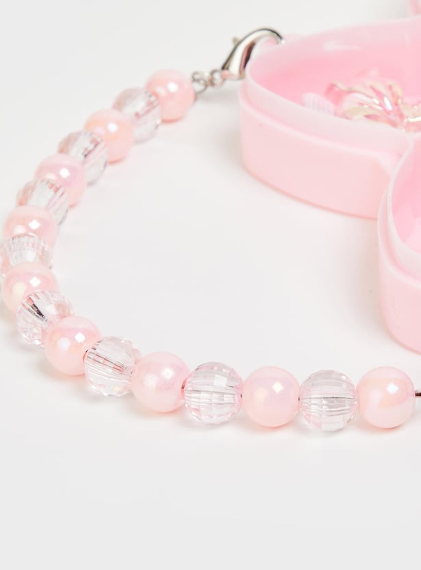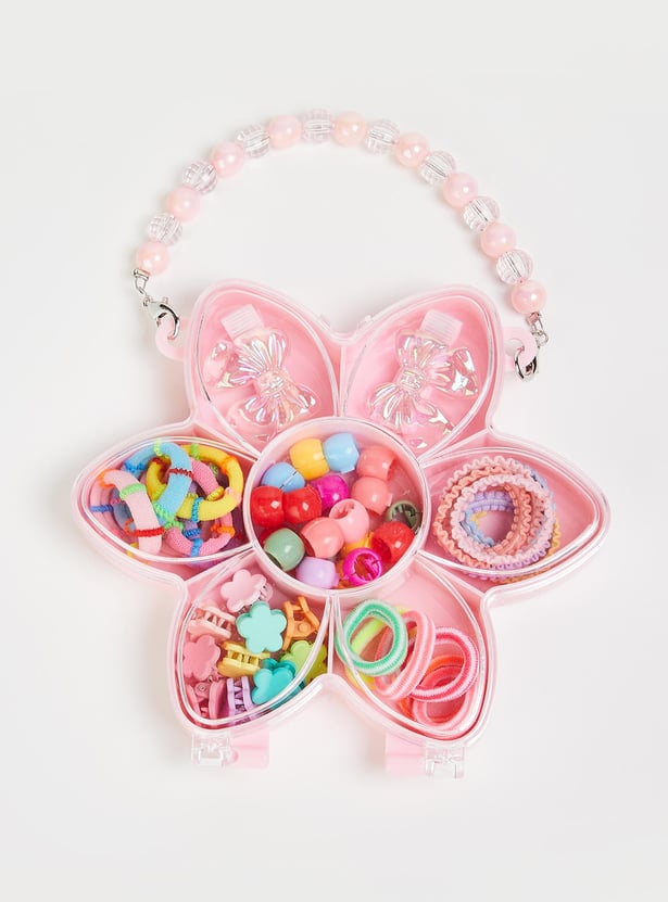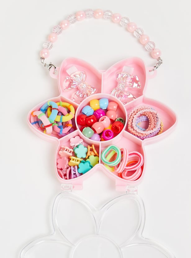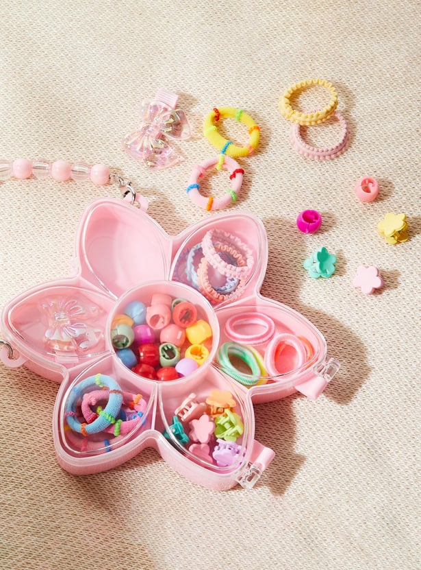 Prettify her hair with this set of hair accessories. It includes an assortment of hair bands and clips. These accessories come in a cute flower-shaped box with a beaded handle.