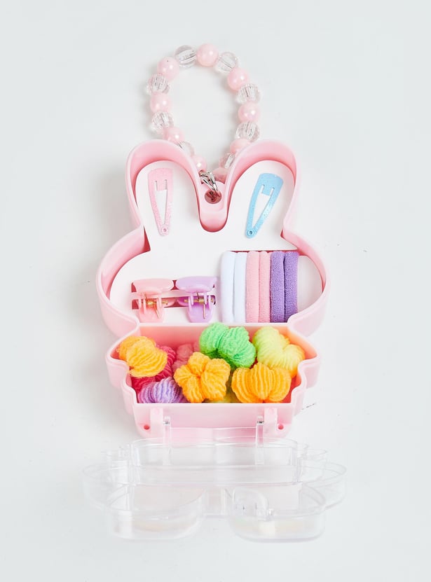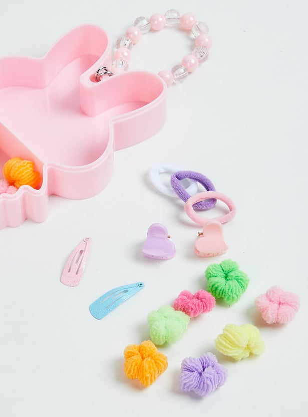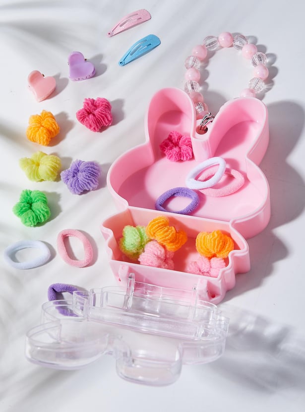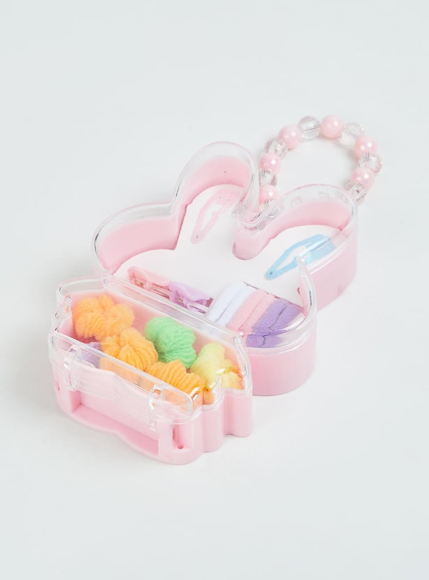 Prettify her hair with this set of hair accessories. It includes an assortment of hair bands, claw clips, and tic tac clips. These accessories come in a cute box with a beaded handle.