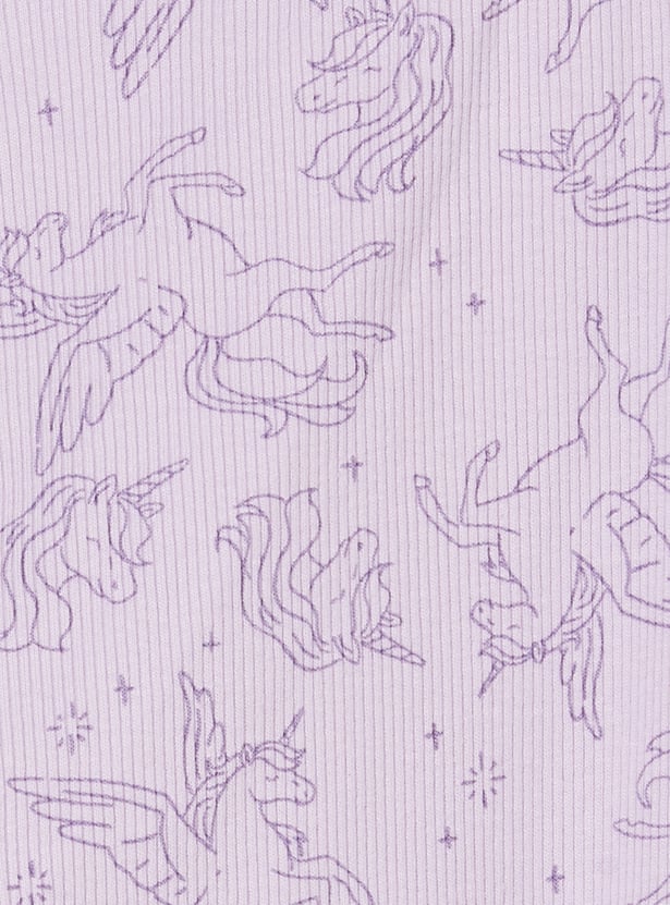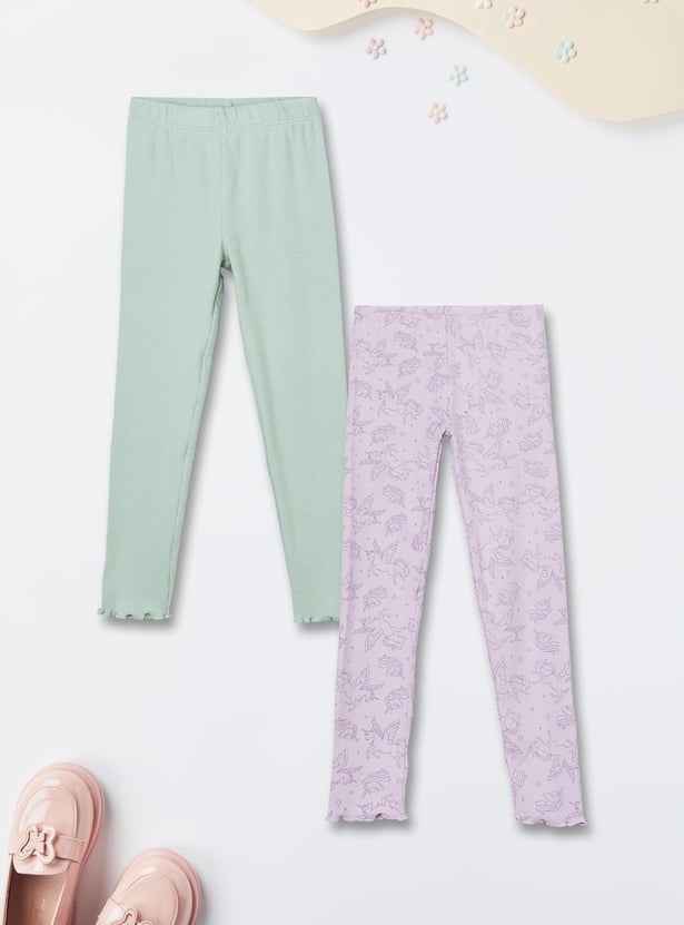 Add a playful touch to everyday dressing with this pack of two leggings, featuring a solid tone and all-over unicorn prints. Designed with a comfortable elasticated waist and finished with delicate lettuce-edge hems, they offer ease of movement while keeping your little one stylish through the day.