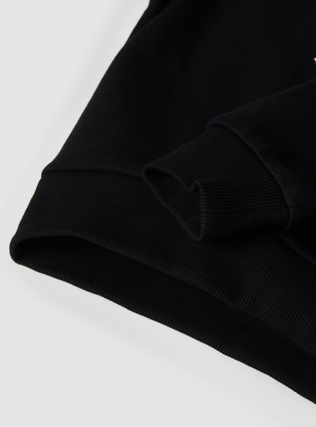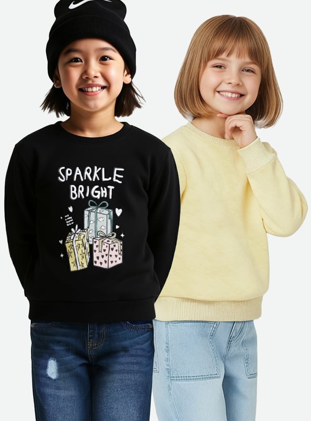Add cosy charm to her everyday wardrobe with this pack of 2 sweatshirts designed for comfort and warmth. Featuring a round neck, full sleeves, and ribbed trims, they ensure a snug fit. One sweatshirt comes with a textured design, while the other features gift prints for a playful touch.