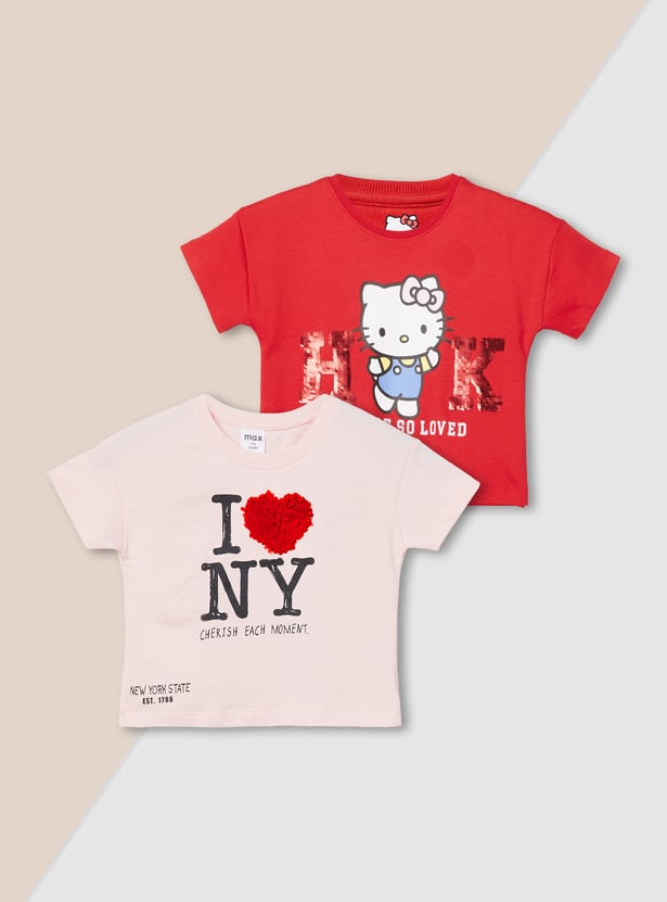 Upgrade your casual wardrobe with this assorted t-shirt pack of 2 featuring a classic round neck and half sleeves. One has an applique design while the other has a Hello Kitty print.
