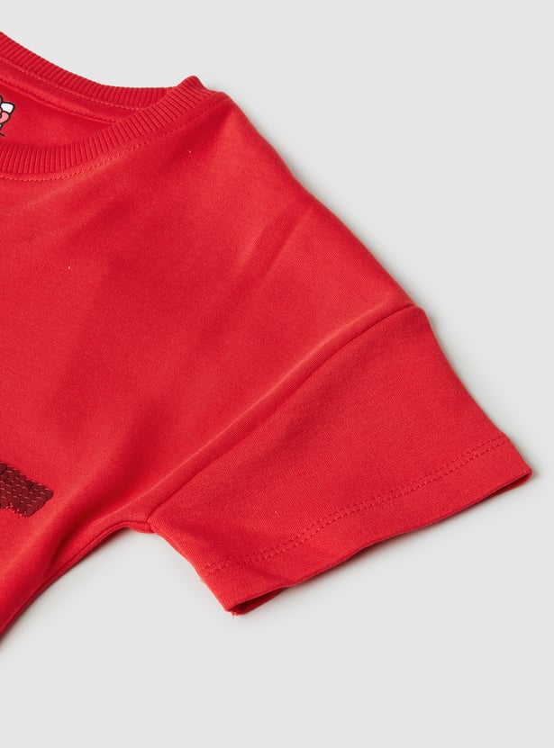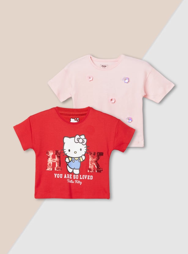 Casual and trendy, this pack of two assorted T-shirts features a classic round neck and half sleeves. Designed for everyday comfort with stylish Hello Kitty prints with embellishments that add a playful edge.