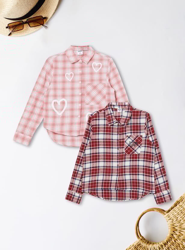Add playful charm to her everyday wardrobe with this pack of shirts. Designed with a plaid pattern, they feature a spread collar, cuffed full sleeves, a patch pocket, and a curved hem for a polished look. One shirt is finished with heart prints, while the other has a smiley print at the back for a fun touch.