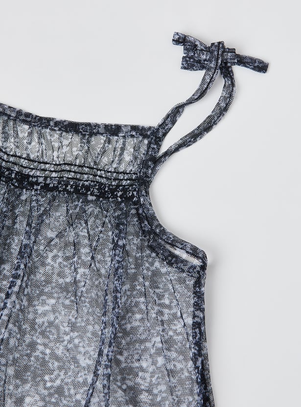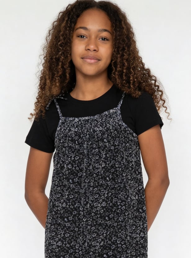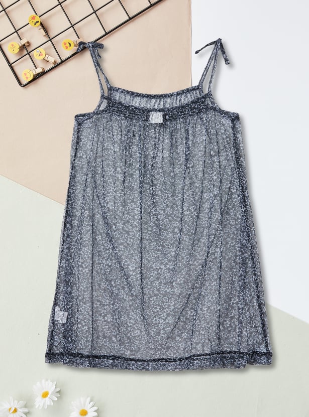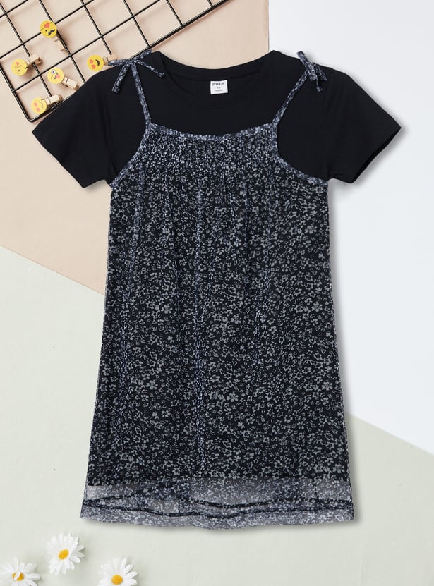 Step into playful layering with this floral print mesh dress paired with a t-shirt. The dress features delicate spaghetti straps and a square neckline, offering a feminine silhouette, while the mesh floral print adds a breezy charm.